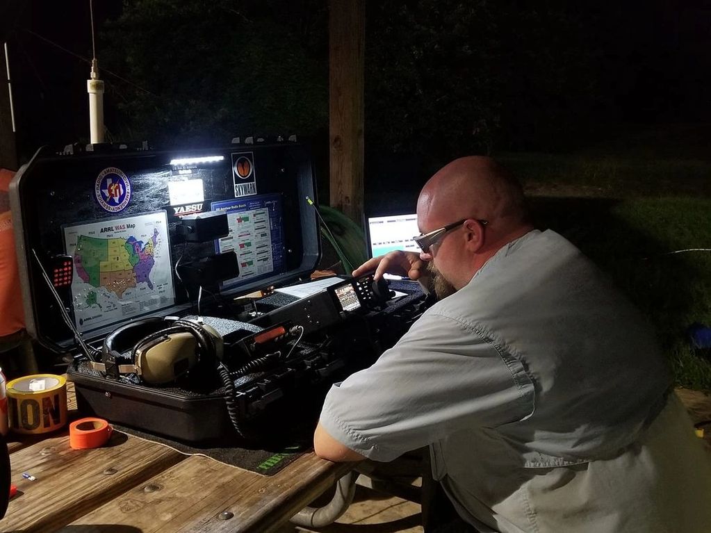 David NE5TX working 80 meters on Field Day 2020. He had a full blown pile up going. It took 3 of us to log all his contacts.