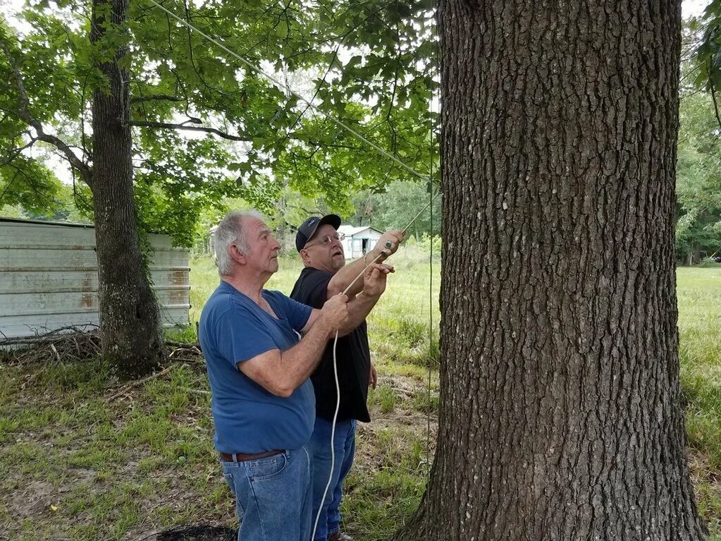 Lamar KC5AOI helping Frank KG5TGF with his antenna. In the pinney woods!